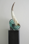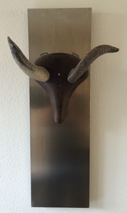 2014Buffelhoorn op messing console tegen rvs plaat.